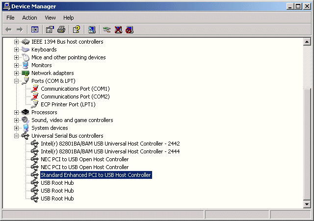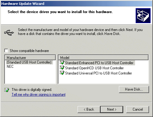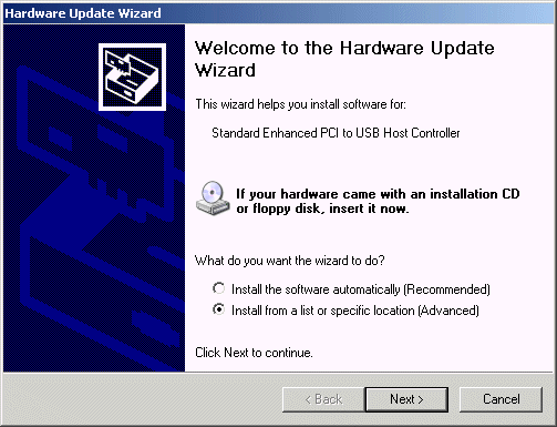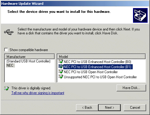 These directions are intended to map a specific version of Microsoft's USB driver in the event that the Standard Enhanced driver has been selected. This is helpful if the card is running an NEC chipset, but hasn't been submitted to Microsoft for WHQL and thus will not find the NEC Enhanced version of Microsoft's driver. Some cards won't work properly with the 'Standard Enhanced' driver. Many thanks to Bruce Laughlin for these screenshots and instructions.