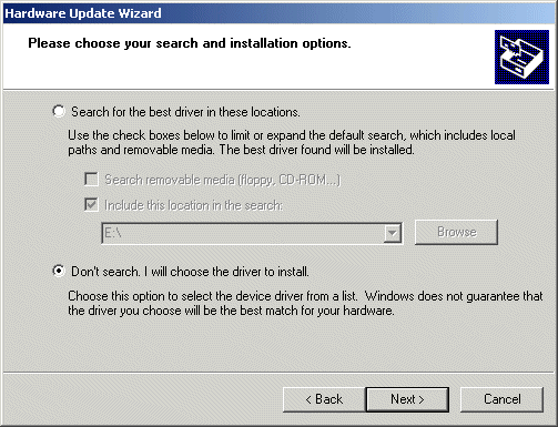 4) Select "Don't search, I will choose the driver to install. Click Next.
