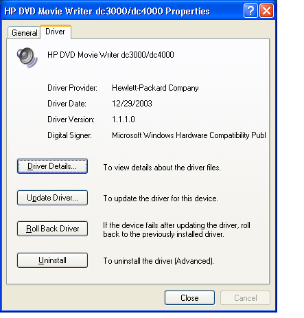 After you're finished, you should check the driver revision level and confirm that you see the results shown above. The original driver was version 1.0.7.0 and was dated 8/5/2003. You'll also notice that the dc3000 now shows up either as an 'HP DVD Movie Writer dc3000/dc4000' or simply a 'HP DVD Movie Writer' under the 'Sound, video, and game controllers' entry in the Device Manager.