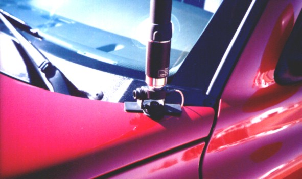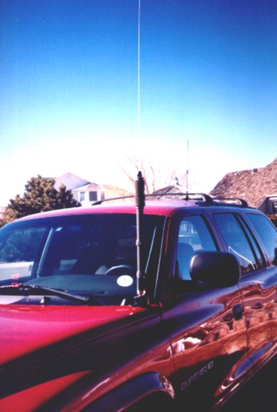 Shown in this photo is the ATAS100 mounted to the hood of the vehicle. I use a separate dual band mag mount whip antenna for VHF/UHF. Both antennas rub on the opening to my garage, but not enough to cause any problems.
