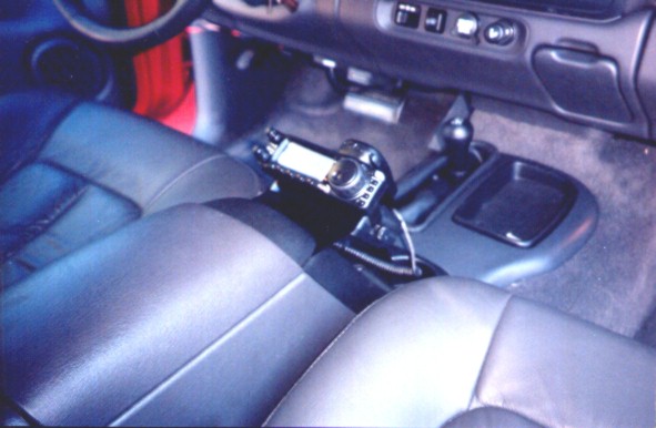 With the armrest open you can see the screws that attach the custom bracket to the center console. The radio is installed down inside the console. Their is a CD/tape holder insert which is removed in this picture, but it fits inside even with the radio installed. The FT100 is just the right size to fit in the empty space under the CD/tape holder.