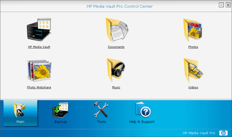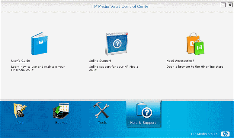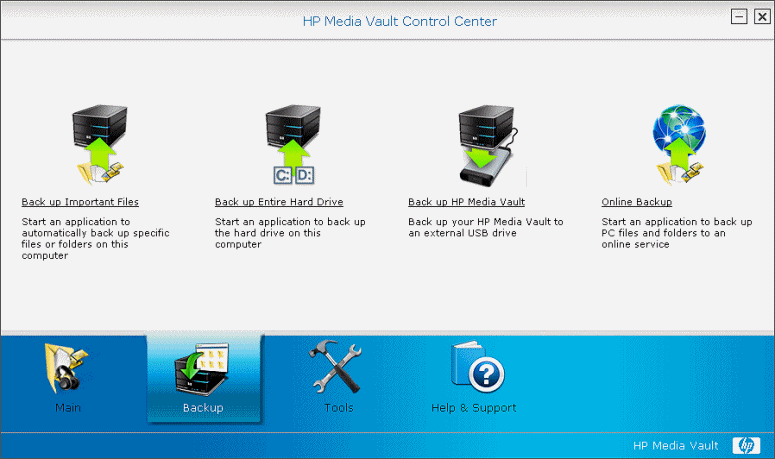 - Back up Entire Hard Drive—Opens an application to back up the hard drive of the computer you are currently using. This feature is only available on the HP Media Vault Pro.