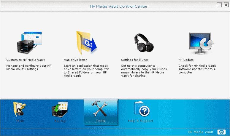 The Tools tab contains features for managing and configuring your HP Media Vault.