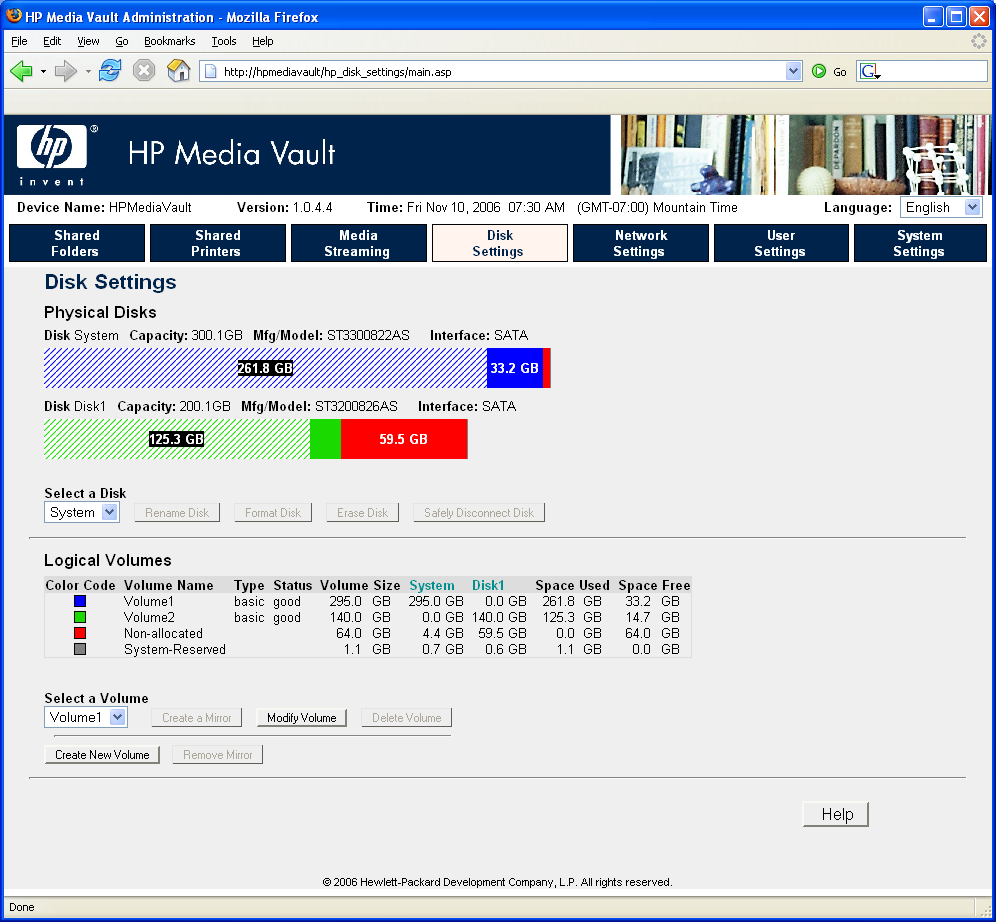 Disk Settings Menu: This allows you to add, format, rename or erase disks and create or modify Volumes. Volumes can be portions of a disk (basic), spanned across disks (concatonated), or mirrored across two disks. You can also change the size of a volume even after you've set it up and have begun adding data to it. Shaded areas show how much of the disks are full. Volumes and Non-allocated space are color-coded.