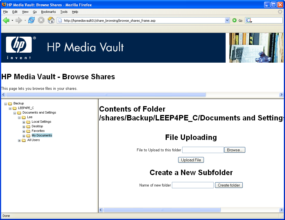 This is a screen shot of a web browser view of the files. You can access your files from anywhere if you set up your router for port forwarding to your HP Media Vault. Folders can be enabled for read only or read/write access. They can also be password protected. You can host some web pages directly from your HP Media Vault if you like.