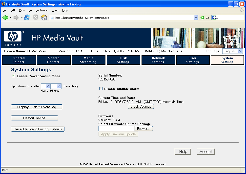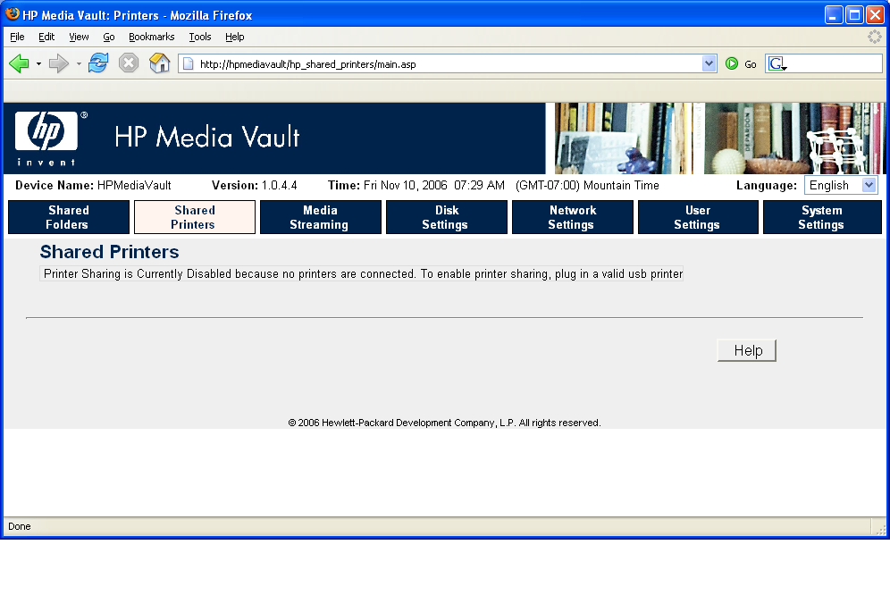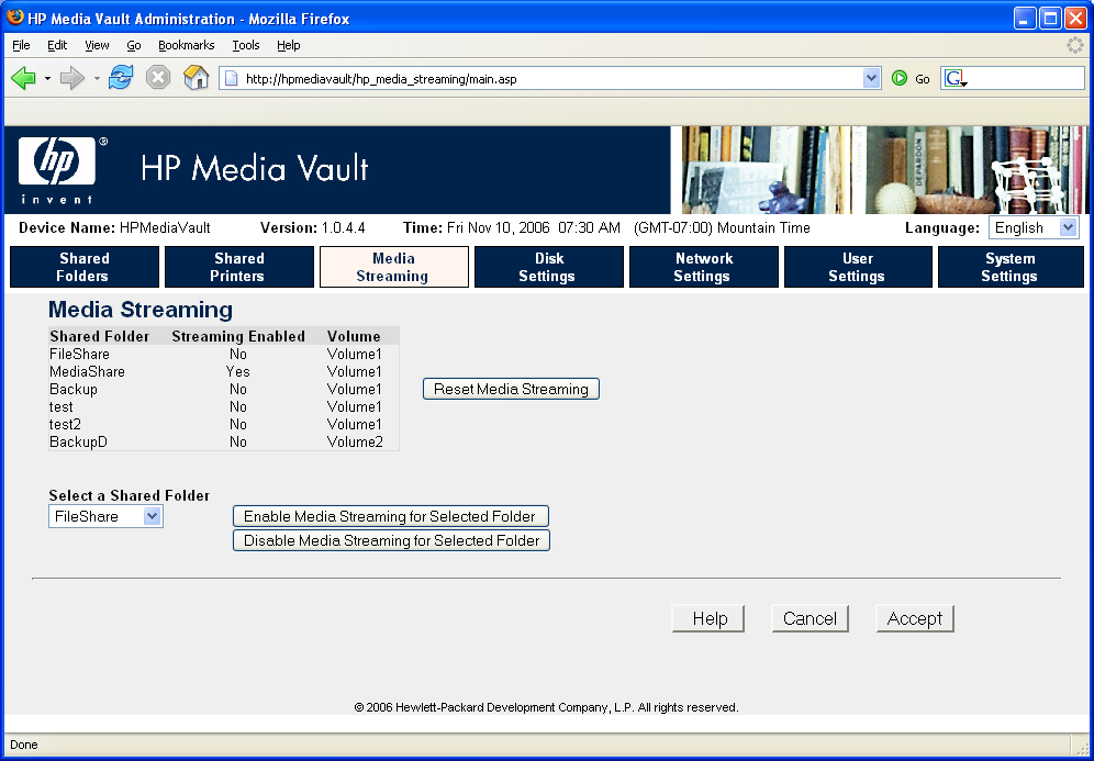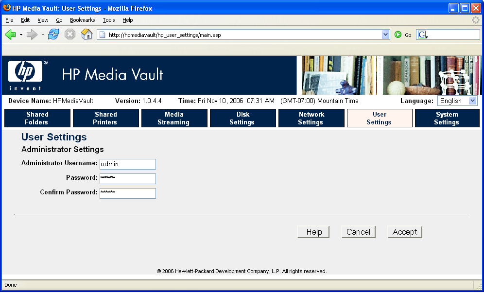 Below are some screen shots of the menu system with brief descriptions of how the menus work. By scrolling through the screen shots, it will give you a feeling for how the HP Media Vault can be configured.