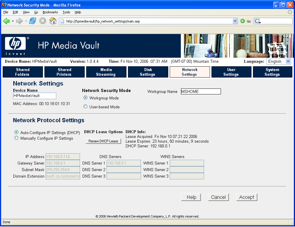 Network Settings Menu. This menu allows you to change the name of the Media Vault or the WorkGroup name. You can also change security from WorkGroup mode to User-based mode here. You can also set up the IP address and related parameters or just leave it set to DHCP so that it automatically finds the Gateway, Subnet mask, etc..