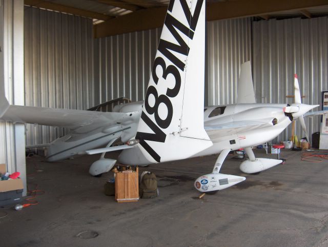 Lee's LongEZ and Marc's Cozy nestled into Lee's T-hangar. With the help of a dolly, it's pretty easy for two EZ-type aircraft to share a single hangar.